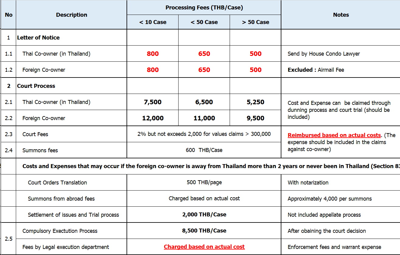- เราแยกค่าใช้จ่าย การส่งจดหมายทวงถาม ทั้งภาษาไทย และภาษาอังกฤษ ออกจากการ ขั้นตอนดำเนินการในชั้นศาล เพื่อประสิทธิภาพในการควบคุมค่าใช้จ่ายของนิติบุคคล เราพร้อมให้คำปรึกษา เพื่อให้แน่ใจว่า ค่าใช้จ่ายที่จะเกิดขึ้นทั้งหมด ได้ระบุเรียบร้อยในจดหมายทวงถาม เพื่อมีผลใช้ดำเนินการในชั้นศาล และคุ้มค่ากับการดำเนินการติดตาม หรือใช้ ทีมทนายดำเนินการ