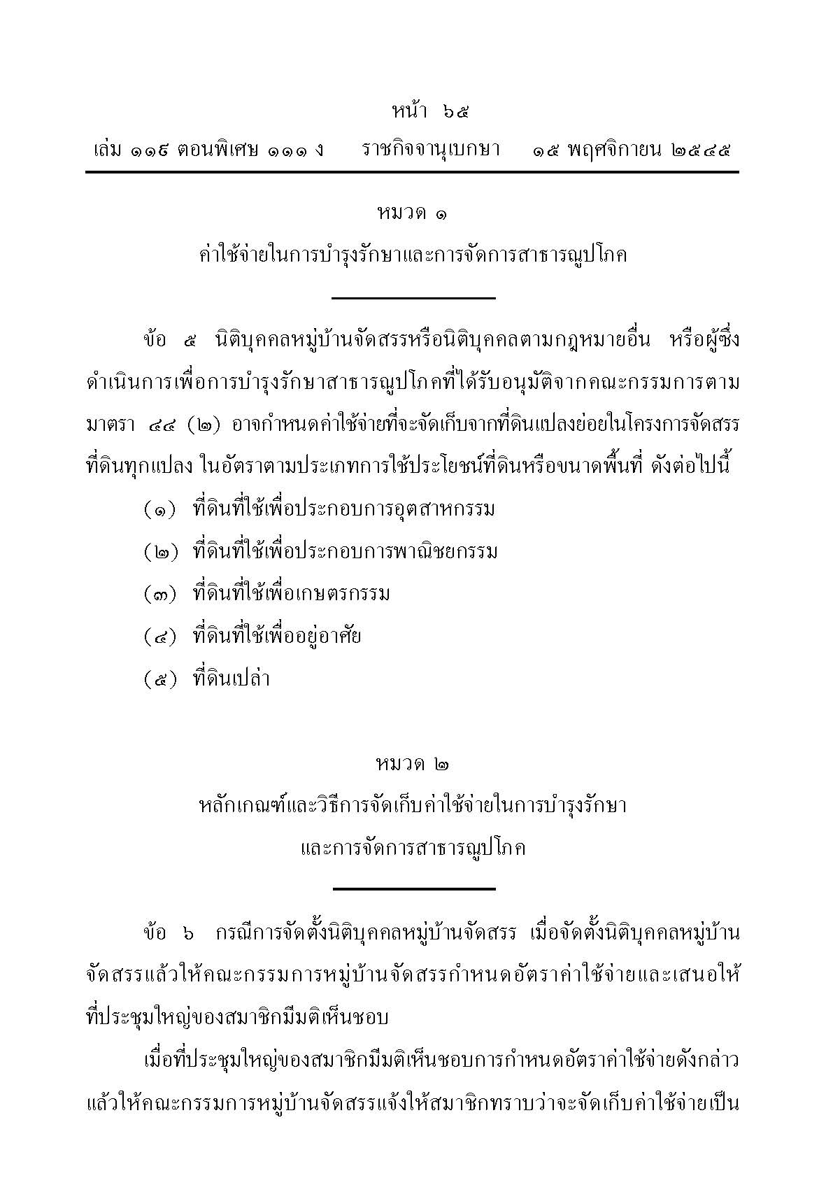 มาตรา 49 ค่าใช้จ่ายในการบำรุงรักษาและการจัดการสาธารณูปโภค ให้จัดเก็บเป็นรายเดือนจากที่ดินแปลงย่อยในโครงการจัดสรรที่ดินทุกแปลง ทั้งนี้อาจกำหนดค่าใช้จ่ายในอัตราที่แตกต่างกันตามประเภทการใช้ประโยชน์ที่ดินหรือขนาดพื้นที่ได้ตามระเบียบที่คณะกรรมการจัดสรรที่ดินกลางกำหนด