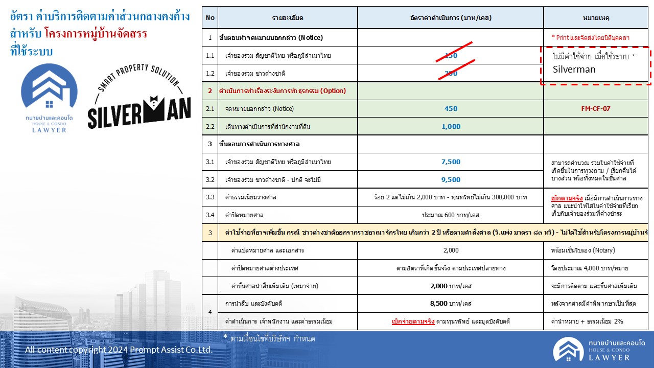 พิเศษ!! ออก “หนังสือบอกกล่าว (Notice)” โดย ทนายบ้านและคอนโด ผ่านระบบ Silverman “ไม่มีค่าใช้จ่าย” ใดใด >>> “ไม่ฟ้อง ไม่ต้องจ่าย” / ค่าดำเนินการคิดตามเคสที่ “ฟ้องจริง” เท่านั้น++ ในอัตราเดียวกัน!!