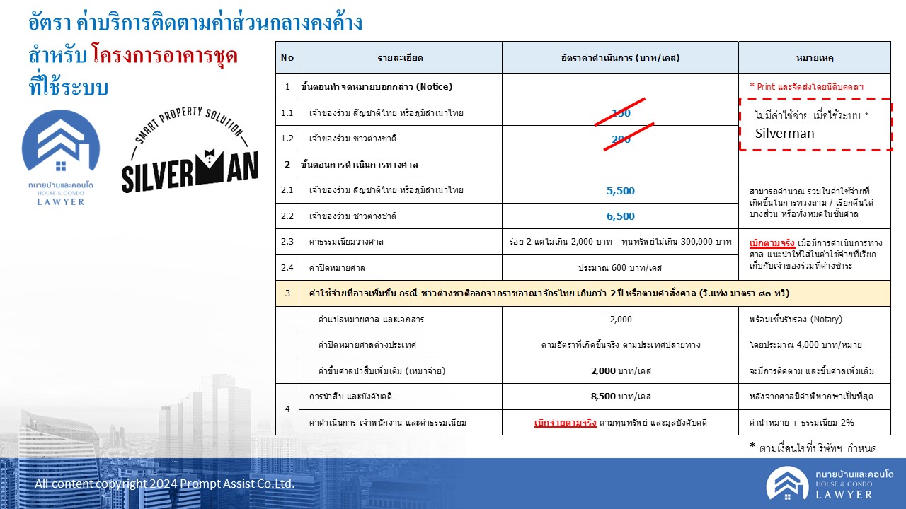 3. สำหรับเจ้าของร่วมชาวต่างชาติ ไม่ควรให้ค้างชำระค่าส่วนกลางเกิน 2 ปี ซึ่งจะทำให้เกิดค่าใช้จ่ายในการดำเนินการทางศาลมาก หากติดตามไม่ได้ ควรรีบดำเนินการทางกฎหมาย