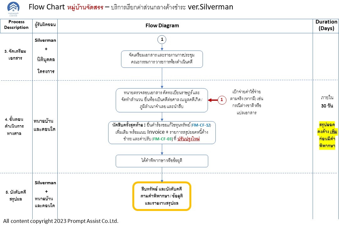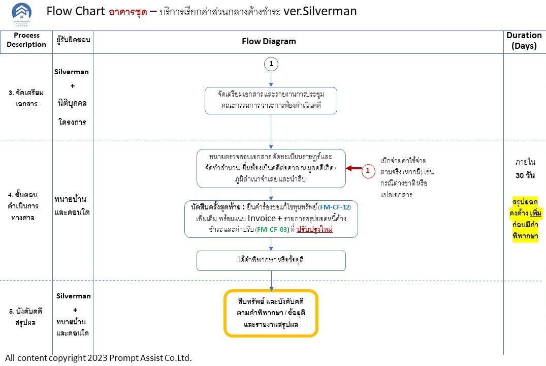 (3) ตรวจดูสำนวนคำร้องก่อนยื่นฟ้องทุกครั้ง และติดตามการยื่นคำร้องระหว่างกระบวนการพิจารณาคดี ให้ครอบคลุมการเรียกหนี้ค่าส่วนกลางที่เกิดขึ้นต่อเนื่อง ระหว่างระยะเวลาพิจารณาคดี และแยกค่าใช้จ่ายระหว่างขั้นตอนการส่ง Notice และการดำเนินการทางศาล เพื่อควบคุมต้นทุนและค่าใช้จ่ายในการดำเนินการ